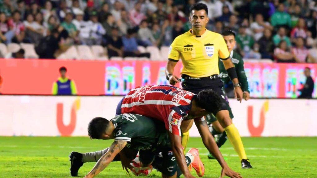 La polémica se desató tras una jugada ocurrida al minuto 15, cuando el mediocampista de León, Nicolás Fonseca, levantó peligrosamente la pierna tras un tiro de esquina, impactando a José Castillo, jugador de Chivas. El árbitro central, Adonai Escobedo, únicamente sancionó juego peligroso, sin mostrar tarjeta alguna ni consultar con el VAR.