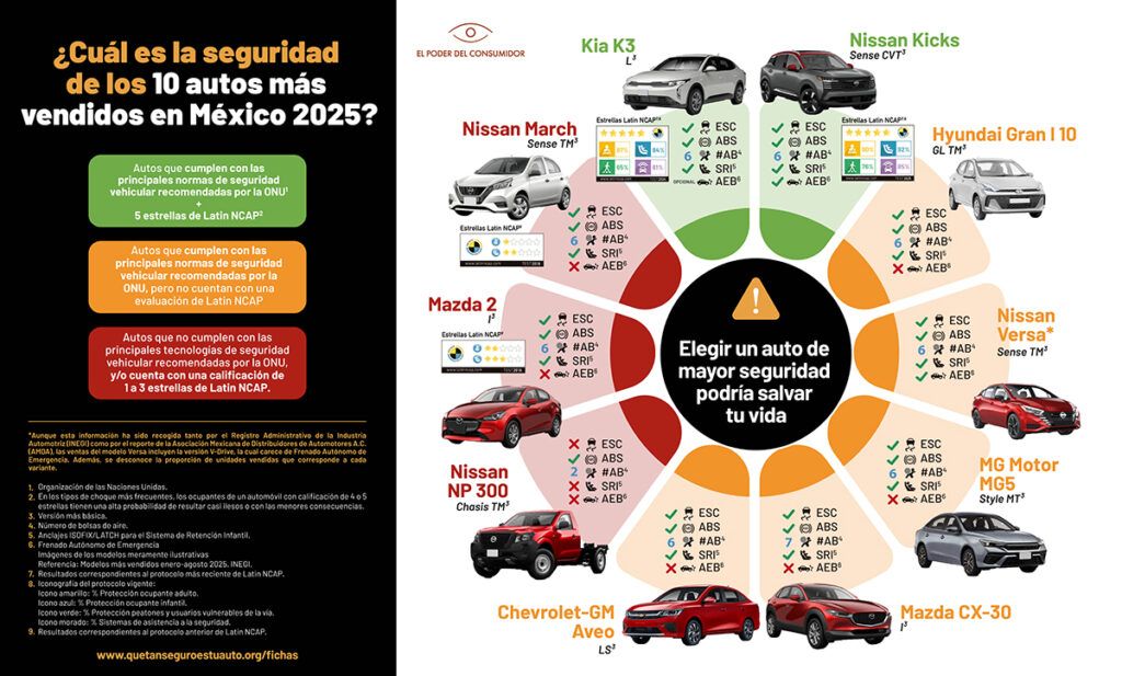 En pleno 2025, el mercado mexicano de autos nuevos refleja una dinámica de ventas que sorprende por su crecimiento moderado, pero que en el fondo revela una falla de gran importancia: la seguridad vehicular. Según un reciente estudio de la organización civil El Poder del Consumidor, de los diez automóviles más vendidos en México en lo que va del año, solo dos modelos —Kia K3 y Nissan Kicks— cumplen con los estándares internacionales recomendados para una mayor protección al conductor y a los pasajeros.