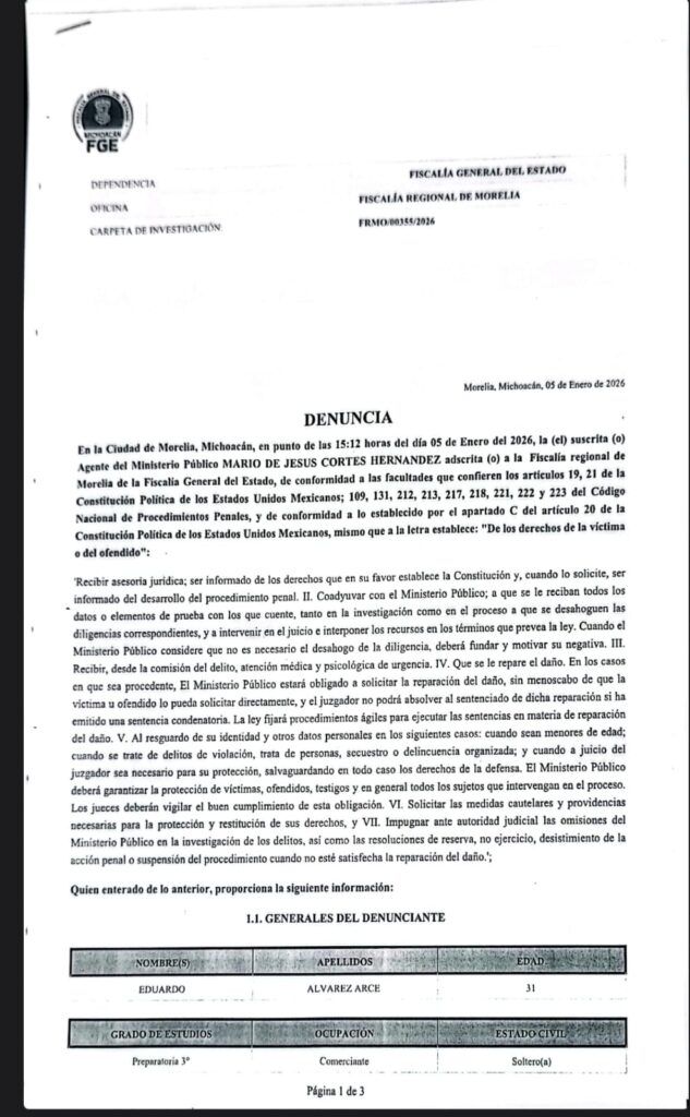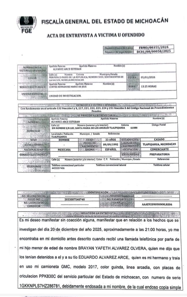 Según consta, en la carpeta de investigación FRMO/00355/2026, de la cual ADR NETWORKS tiene copia, Eduardo Á. circulaba por el Centro de la cabecera municipal, el pasado 20 de diciembre del 2025, cerca de las 20 horas, a bordo de un vehículo particular, en compañía de un menor de edad.