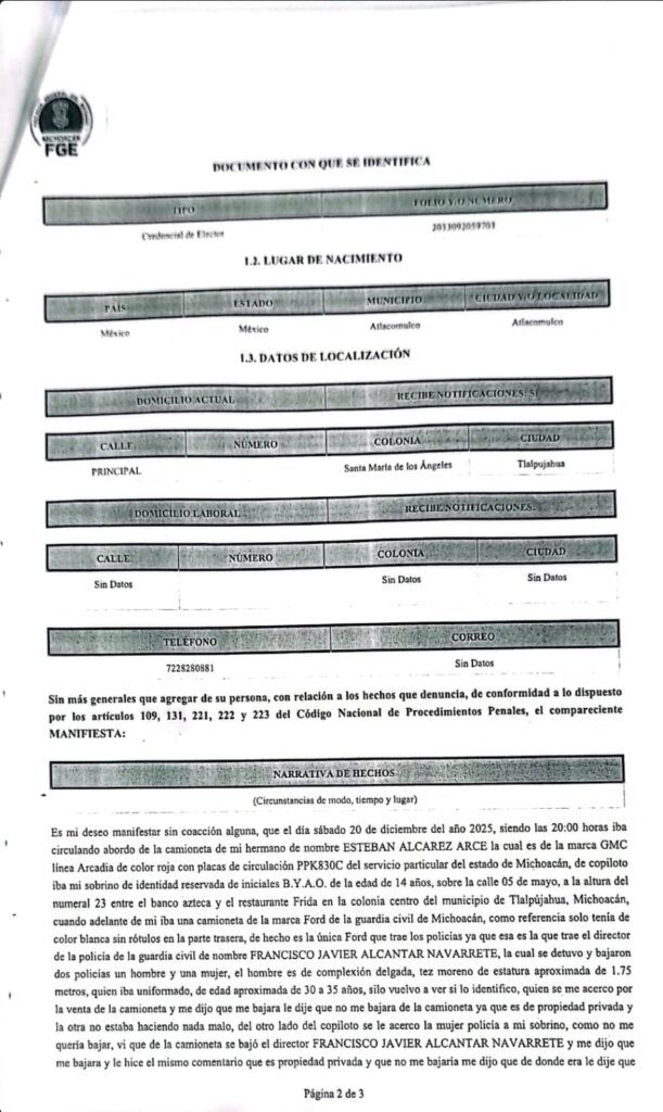 Sin embargo, sorpresivamente fueron interceptados por una unidad, con siglas de la Guardia Civil Michoacán, de donde descendieron algunos policías, entre ellos, el titular de la Dirección de Seguridad Pública Municipal, Francisco Javier Alcántar Navarrete, quien ordenó, bajo amenazas y agresiones, bajarlos de su vehículo.