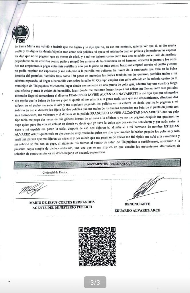 Al día siguiente, ambas víctimas acudieron al Centro de Salud de Tlalpujahua para que les extendieran un certificado médico y quedara constancia de este hecho, en medio del temor de interponer una denuncia de inmediato, ya que, a su decir, existe varios testimonios sobre agresiones a cargo de funcionarios y elementos policiales municipales, los cuales no han procedido, por causas desconocidas.