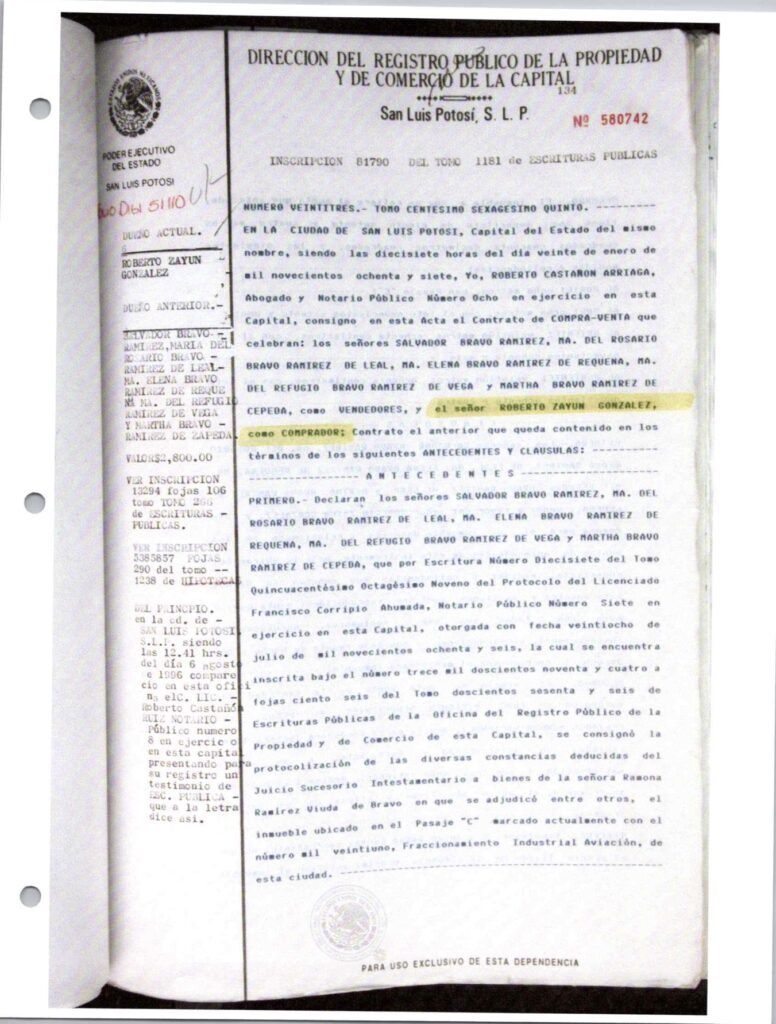 Se trata de una propiedad de 174.40 metros cuadrados en el Fraccionamiento Industrial Aviación de San Luis Potosí, adquirida el 20 de enero de 1987 por un monto de dos millones 800 mil pesos pagados de contado. La operación se realizó en la Notaría Pública número 8 de Roberto Castañón Arriaga.