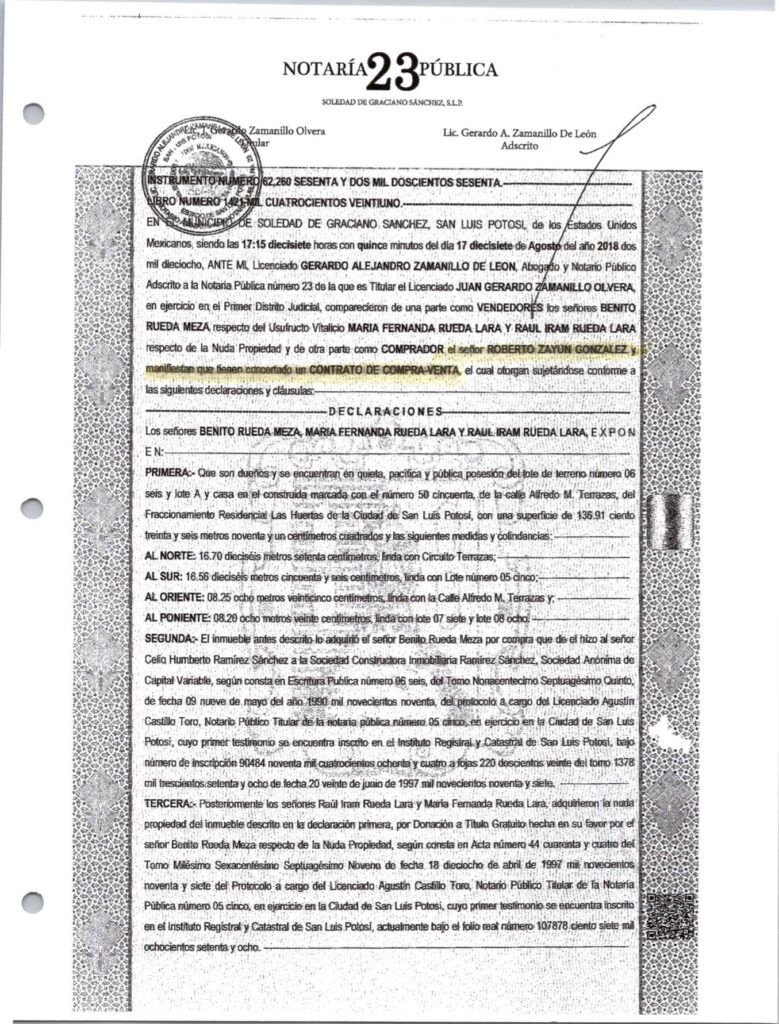 Y el 15 de julio del 2024 pagó cinco millones y medio por una propiedad de 250 metros cuadrados en el Conjunto San Rafael de San Luis Potosí, compra efectuada ante el Notario Público Notaría 19, encabezada por Alfredo Noyola Robles.