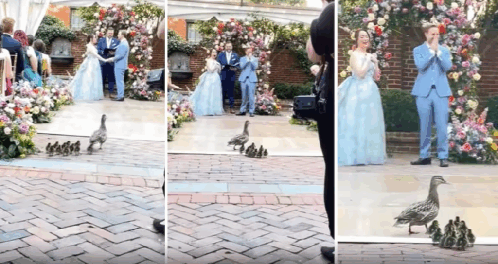 Según relataron en la publicación, la ceremonia transcurría con normalidad hasta que varios patos aparecieron repentinamente y comenzaron a caminar por el pasillo central, justo por donde los novios se dirigían al altar. Los animales se detuvieron unos segundos en el centro del lugar, captando la atención de todos los presentes, antes de seguir su camino por un costado.