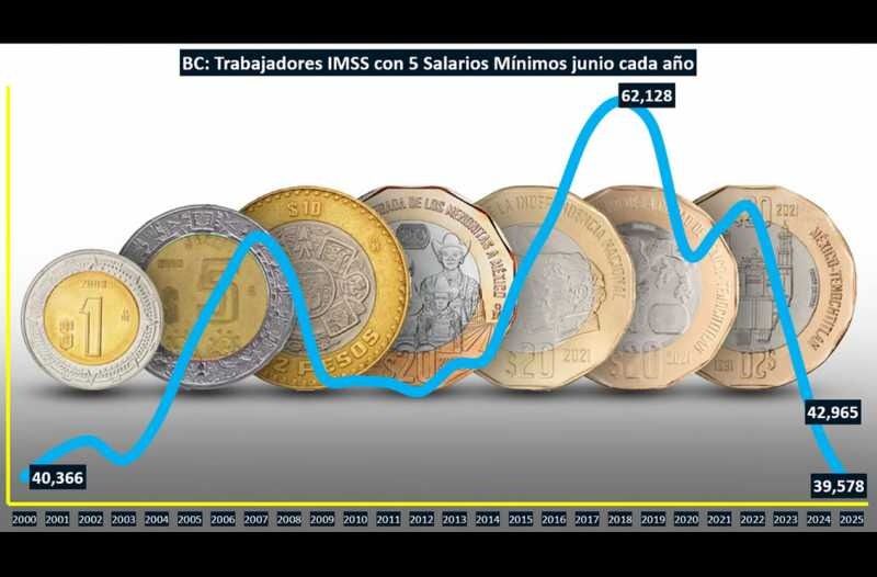 TIJUANA BC 22 DE JULIO DE 2025 .- En Baja California, los trabajadores formales que ganan 5 Salarios Mínimos marcaron una reducción del 8% a tasa anual durante junio de 2025 en comparación al mismo mes del año anterior, indican los resultados delegacionales del Instituto Mexicano del Seguro Social (IMSS).