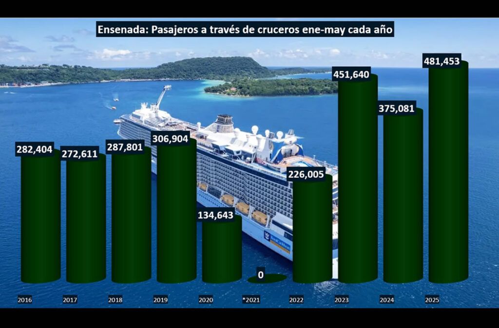 De acuerdo con los resultados de Datatur para Ensenada, se registró el mayor número de cruceristas desde que se cuenta con registro disponible para un periodo acumulado entre enero y mayo de cada año.