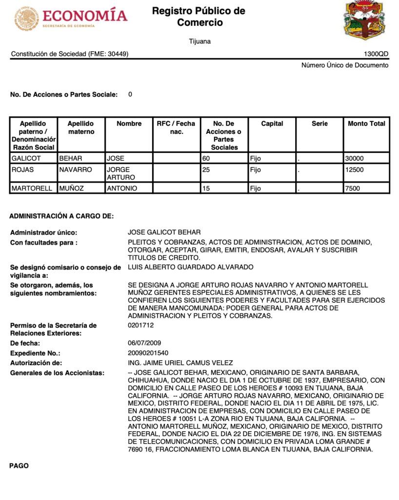 José Galicot fue registrado con el 60 % de las acciones y como administrador único, con las facultades para realizar pleitos, cobranzas, actos administrativos y actos de dominio.