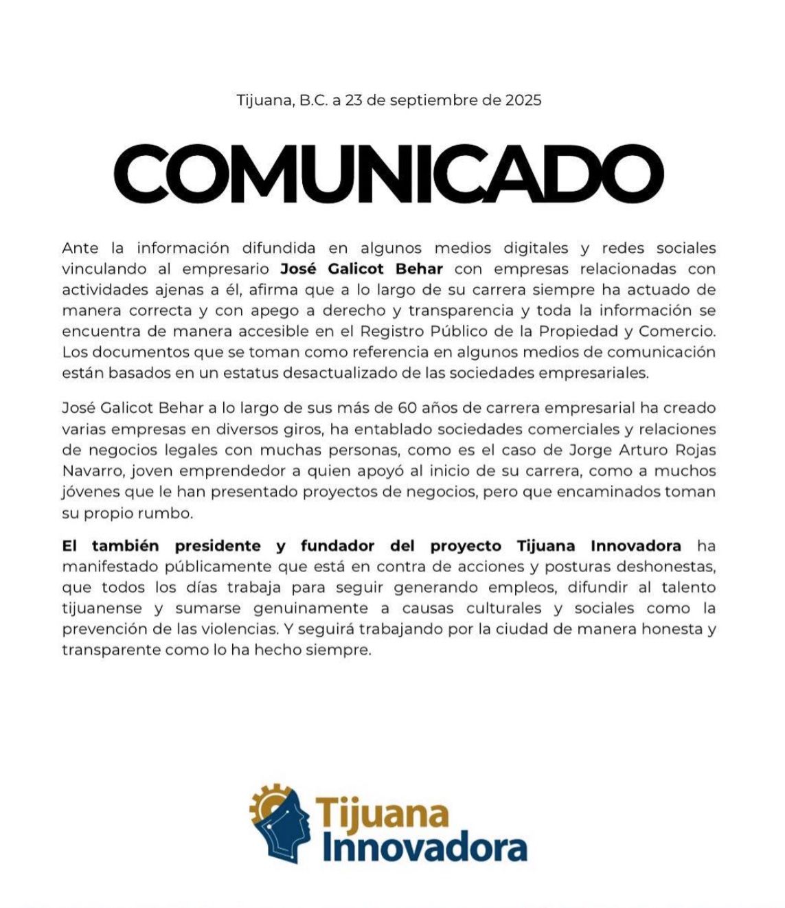 Mediante un comunicado de Tijuana Innovadora, una organización no gubernamental en la que Galicot aparece como integrante del Consejo Directivo, el empresario reconoció que tuvo sociedades empresariales con Rojas Navarro, pero se deslindó de las denuncias del gobierno estadounidense.
