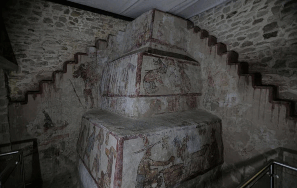 Al cruzar esa puerta, el aire se siente denso como en un sauna. Allí está la Señora del Atole, pintada de pie, entregando una gran vasija a otra mujer más joven, vestida con prendas sencillas. La escena se enmarca en la Subestructura IV, un basamento de 4.7 metros de altura donde los muros narran escenas de un mercado, algo único en el arte maya.