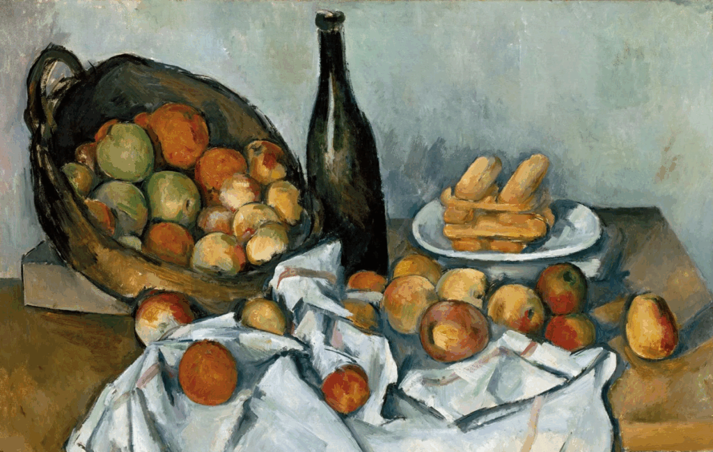 Cézanne buscó la geometría en la naturaleza, especialmente en sus célebres naturalezas muertas con manzanas. Para él, la pintura era cuestión de volúmenes, y estas frutas se convertían en esferas vivas dentro de un universo geométrico personal.